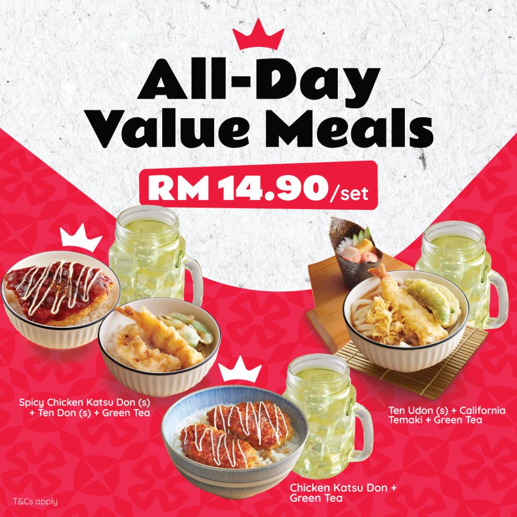 All-Day Value Meals Weâre thrilled to bring back our all-day low-price meals at just RM14.90 (EM: RM15.90). As always, all 5 of our value meal options come with a COMPLIMENTARY Shizuoka Cha! Bestseller: Chicken Katsu Don Bestseller: Ten Udon Double Don: Ten Don (S) & Spicy Chicken Katsu Don (S) Light Meal: Tenpura Udon (S) […]